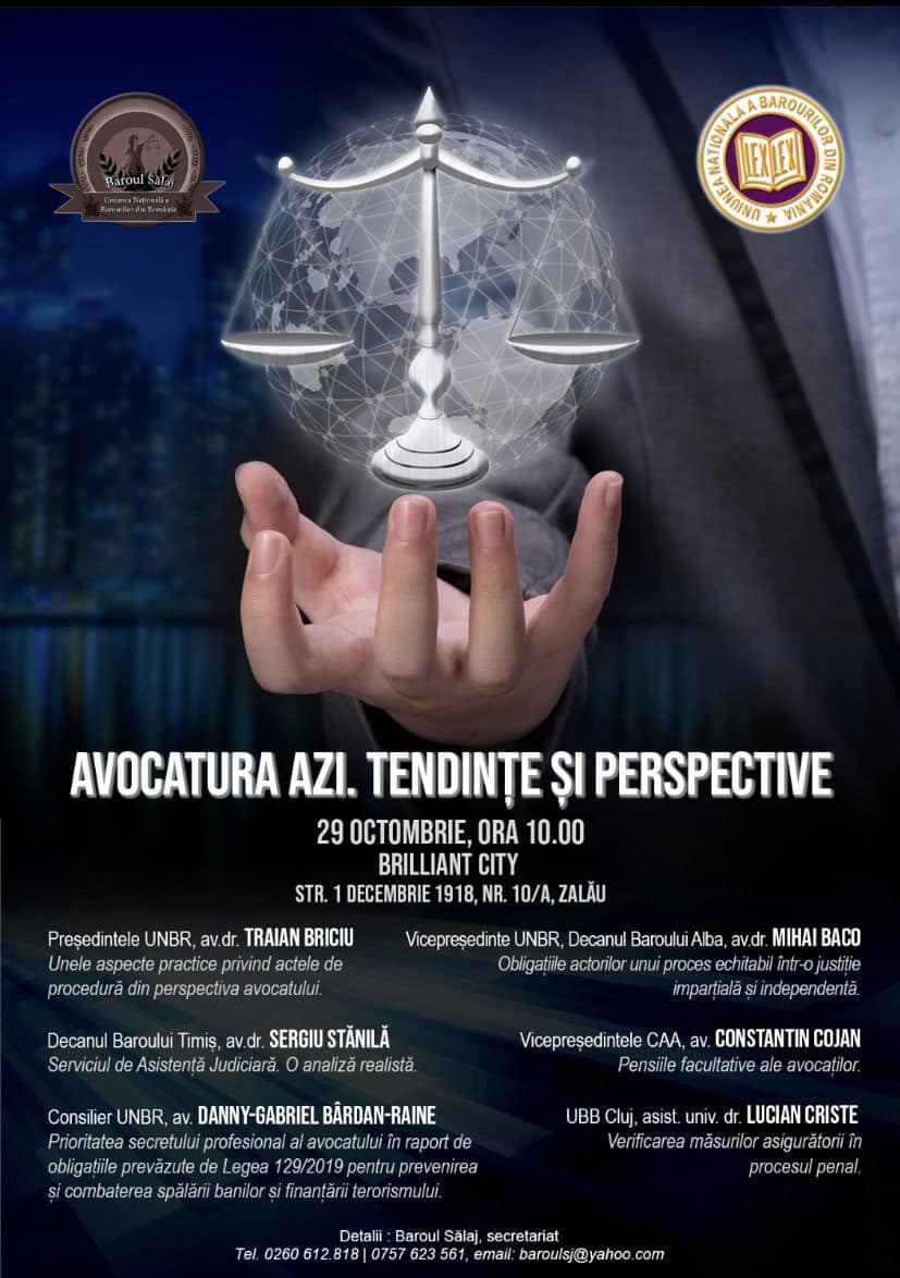 Prezentarea temei „Prioritatea secretului profesional al avocatului în raport de obligațiile prevăzute de Legea 129/2019 pentru prevenirea și combaterea spălării banilor și finanțării terorismului” în cadrul conferinței Avocatura azi. Tendințe și perspective, eveniment profesional organizat de Baroul Sălaj în parteneriat cu Uniunea Națională a Barourilor din România. Felicitări domnului decan avocat Cristian Tărău, consilierilor: avocat Andrea Ciortea – Suciu și avocat Călin Tulbure care alături de doamna Veronica Morecuț au organizat un eveniment profesional deosebit.